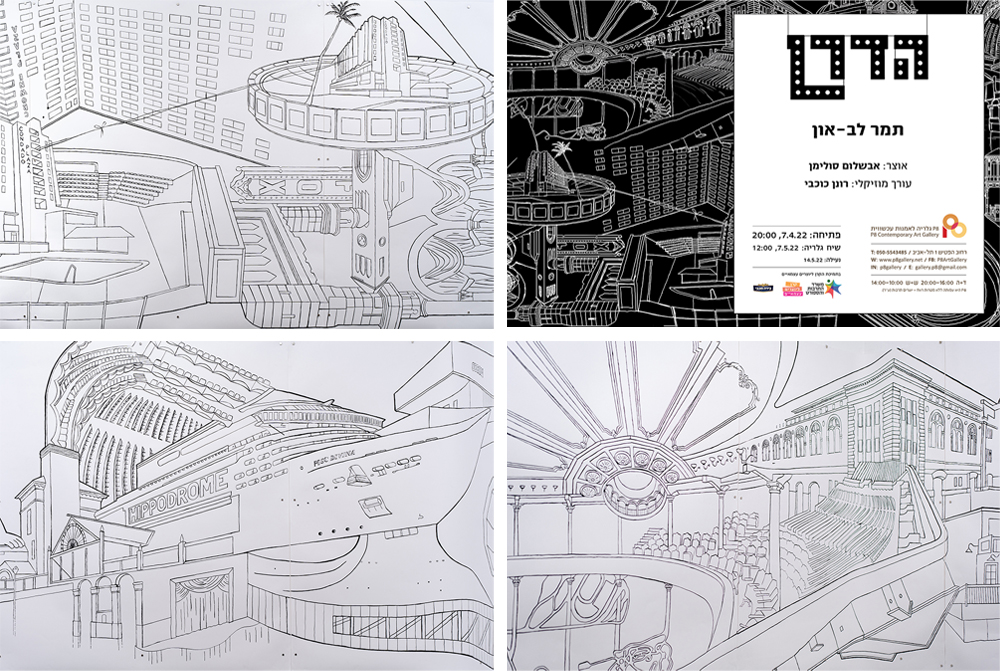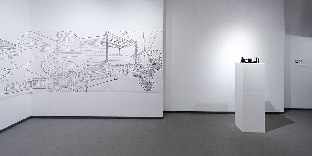 It is a scrutiny of the space that enables a disaster, without the event that initiates it (the show). The space inhabits two different but similar collage pieces. The first one is a ghost ink drawing on paper surrounding the gallery walls, presenting an impossible architectural sequence, a chaotic panorama of parts of the arenas that hosted the shows. The second branch is an audial collage of songs and sounds that were played on stage – a dynamic soundtrack mixed by musician Ronen Kohavi, that paints the drawing in changing colours over time. A link to the full exhibition text written by the curator Avshalom Suliman (Hebrew). Installation views: Daniel Hanoch. Video: Oren Dai, Daniel Hanoch. |