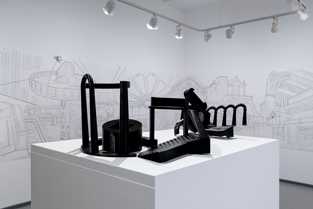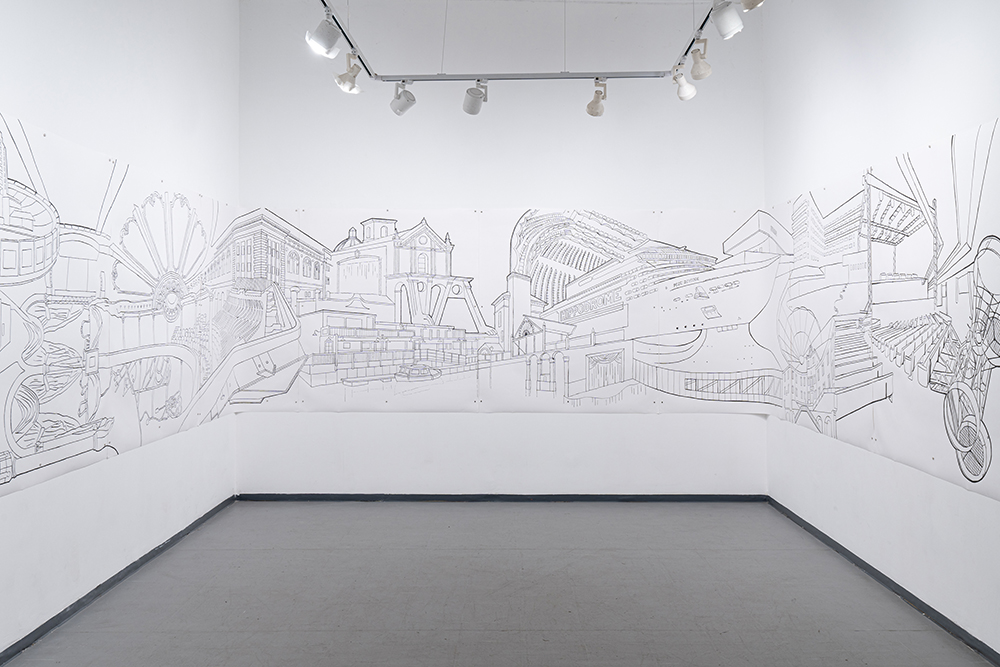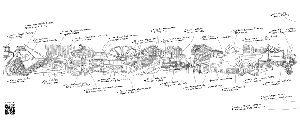 החלל מארח שתי עבודות קולאז'יות שונות ודומות. בראשונה רישום רפאים בדיו על נייר שעוטף את קירות הגלריה ומציג רצף אדריכלי בלתי אפשרי, פנורמה כאוטית, של אותן זירות בהן התרחשו חלק מההופעות. הענף השני הוא קולאז' אודיאלי של שירים וקטעי סאונד שהתנגנו בהופעות – פסקול דינמי שצובע את הרישום בגוונים שמתחלפים רגעית, שערך המוזיקאי רונן כוכבי. קישור לטקסט המלא שכתב אוצר התערוכה אבשלום סולימן. צילומי הצבה: דניאל חנוך. וידאו: דניאל חנוך, אורן דאי. התערוכה בתמיכת הקרן ליוצרים עצמאיים |